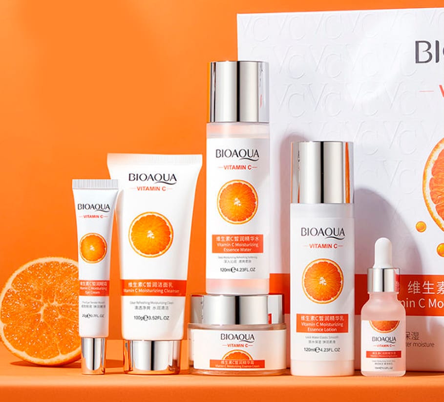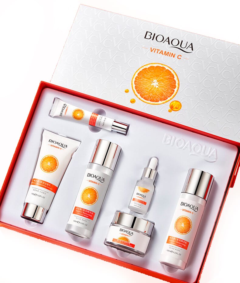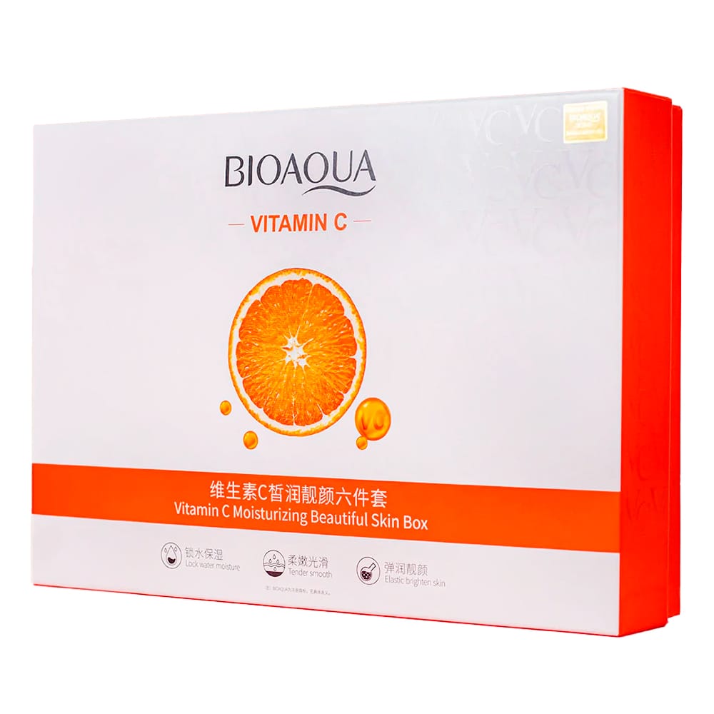 el kit de vitamina C Bioaqua en caja, está compuesto por 6 productos esenciales para una rutina de skin care completa, la vitamina C protege la piel contra los radicales libres y ayuda a prevenir el envejecimiento prematuro y los daños causados por el sol y la contaminación.